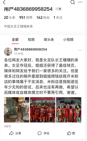 2月7日上午,王珊珊弟弟在头条开通账号,对此事进行了回答。