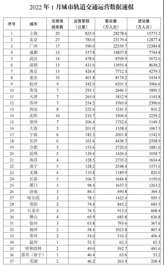 据交通运输部微信公众号7日消息,2022年1月,31个省(自治区、直辖市)和新疆生产建设兵团共有51个城市开通运营城市轨道交通线路270条,运营里程8759公里,实际开行列车285万列次,完成客运量18.0亿人次,进站量10.8亿人次。
