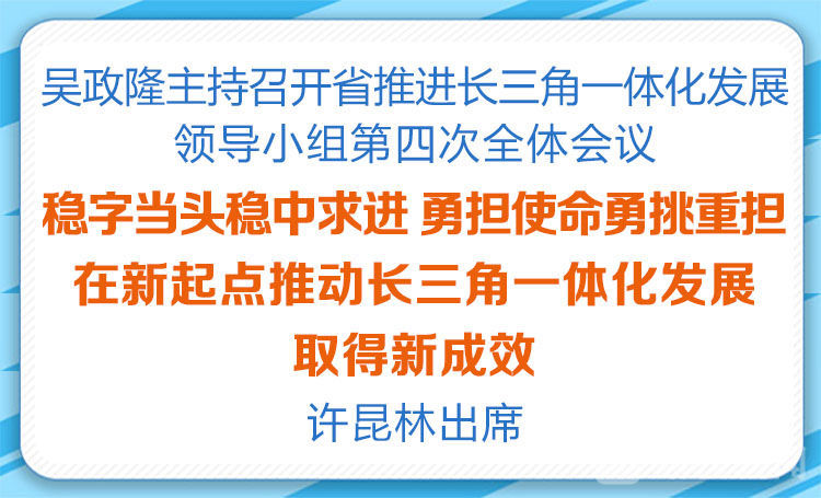 荔枝新闻讯 2月7日,省推进长三角一体化发展领导小组召开第四次全体会议。省委书记、省推进长三角一体化发展领导小组第一组长吴政隆主持会议并对抓好区域一体化发展重点工作和当前工作作部署,省长、领导小组组长许昆林就具体工作作安排。会议强调,要坚持以习近平新时代中国特色社会主义思想为指导,深入学习贯彻习近平总书记对推动长三角一体化发展和对江苏工作的重要讲话重要指示精神,认真落实国家推动长三角一体化发展领导小组第四次全体会议要求,坚持稳字当头、稳中求进,统筹疫情防控和经济社会发展,统筹发展和安全,完整准确全面贯彻新发展理念,加快构建新发展格局,紧扣一体化和高质量两个关键词,勇担使命、勇挑重担,在新起点推动长三角一体化发展取得新成效。