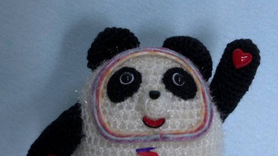 卫阿姨试了好几次,终于找到合适的冰丝。 而最难的部分,是如何表现面罩边缘彩色的炫光效果。卫阿姨选择了几种渐变色的毛线排列起来,并且用透明塑料片作为固定的基底。为了达到最佳效果,卫阿姨仅塑料片就裁剪十几条,以找到最吻合熊猫脸部弧度的角度,让立体感体现出来。反复琢磨颜色搭配,身体部位大小比例,卫阿姨终于做出令自己满意的“冰墩墩”。