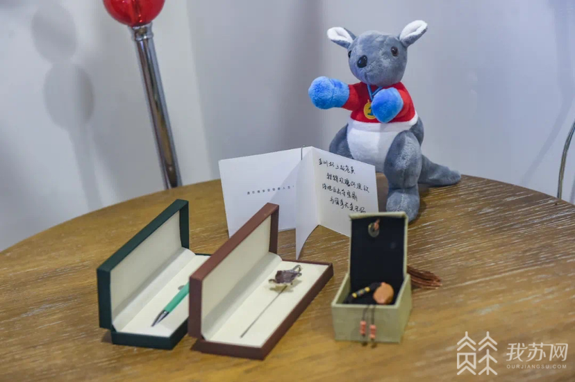 此外,苏州还为每位女足姑娘,准备了一份礼物,一张手写贺卡、一枚雕刻着太湖水风车的核雕、一枚书签、一支钢笔以及一只挂着金牌的袋鼠玩偶,为凯旋归来的中国女足,送上最热烈的祝贺和欢迎。