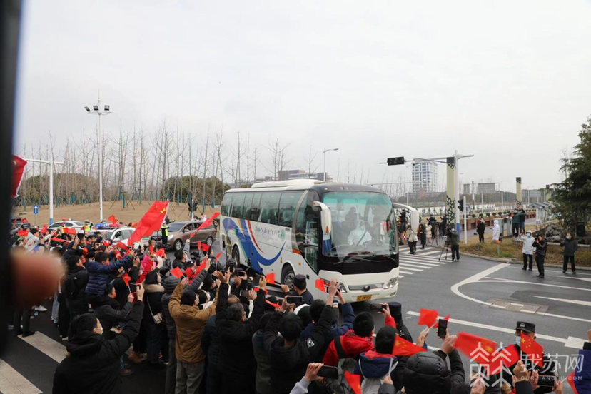 今天(2月8日)上午,夺得2022年女足亚洲杯冠军的中国女足乘车抵达苏州,不少球迷和市民手拿五星红旗、拉起横幅到驻地外围热情迎接。