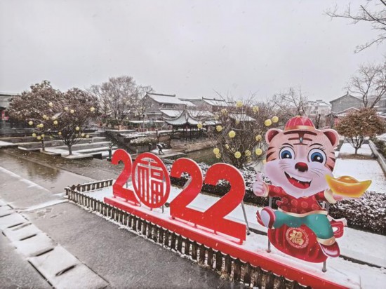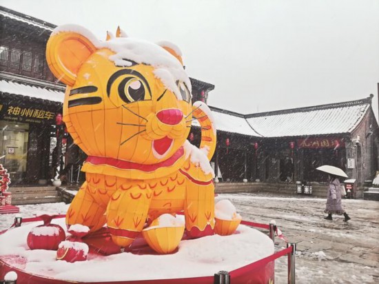 在泰州老街,雪中的“生肖虎”意趣盎然。