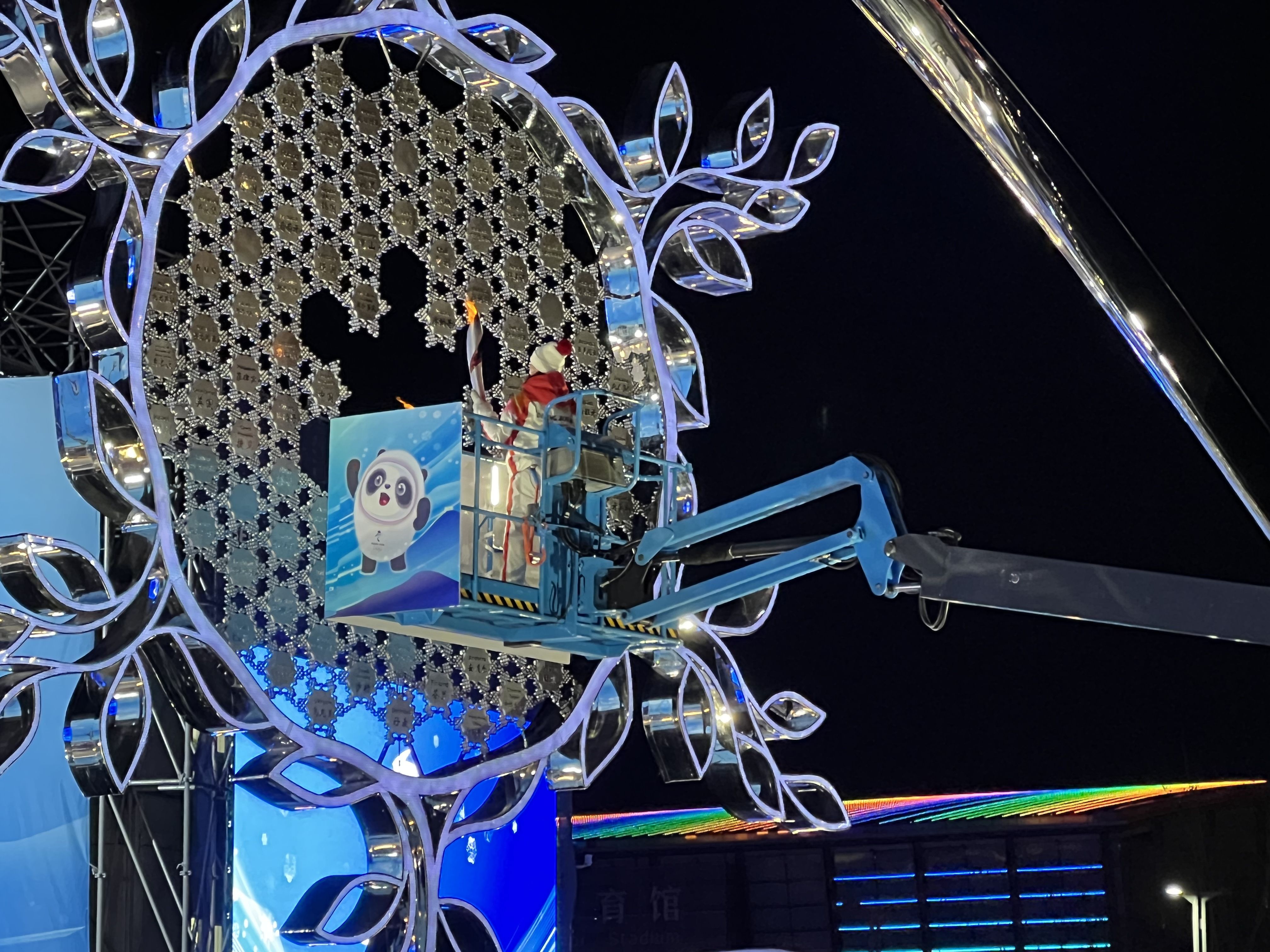 2月4日,北京冬奥会开幕式当天的中午 12 点,负责分火炬台的工作人员已经全部就位。众能联合的工程师检查设备电量是否够用,伸缩臂工作是否正常,人和设备都已进入“临战”状态。