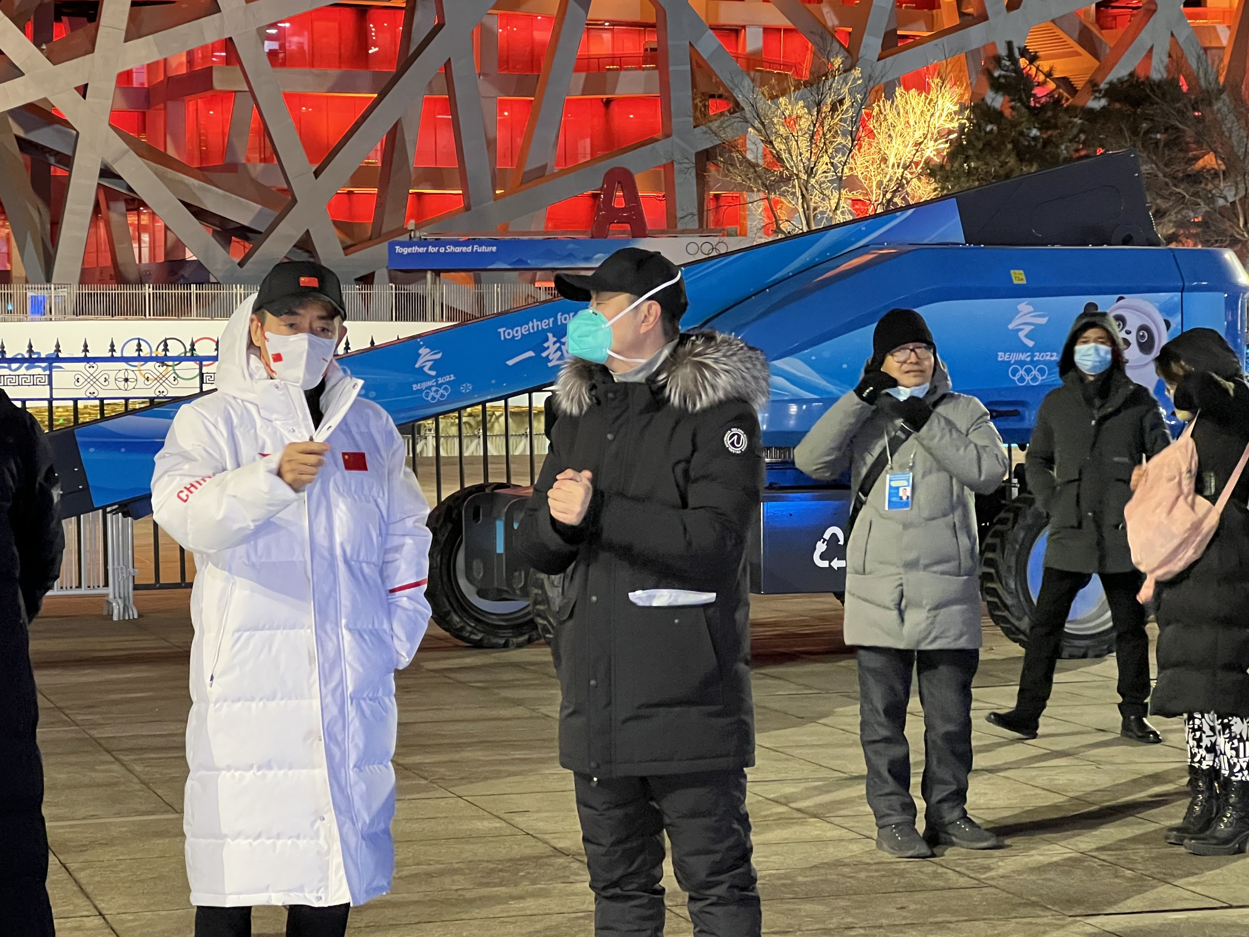 2月1日大年初一的晚上,鸟巢外的分火炬点火仪式流程进行第二次演练,从火种车进场到火炬手登上高空作业平台点燃分火炬,再下降回到地面、设备退场,看上去非常顺利。