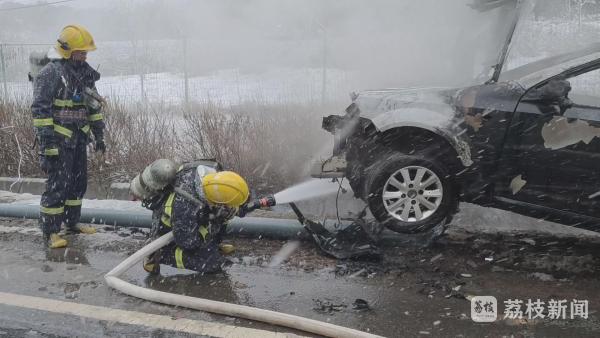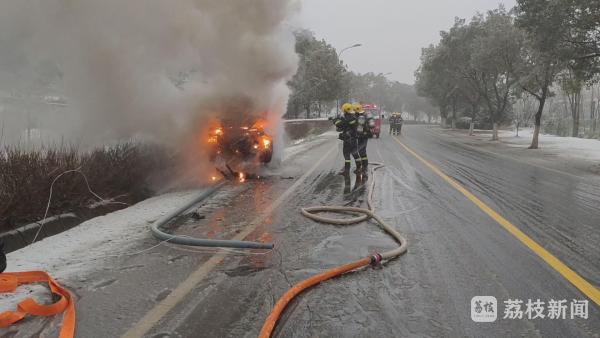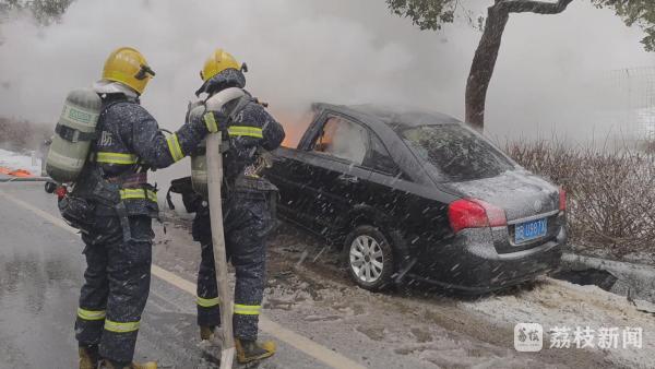 昨天(2月7日)上午7点,无锡宜兴市丁蜀镇川善路发生一起事故,一辆轿车由于路面湿滑,刹车打滑后撞到了路边电线杆并起火燃烧,接到报警后,消防员立即赶赴现场进行处置。
