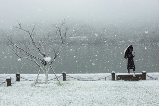 2月7日,游客在杭州西湖景区赏雪。新华社记者江汉 摄