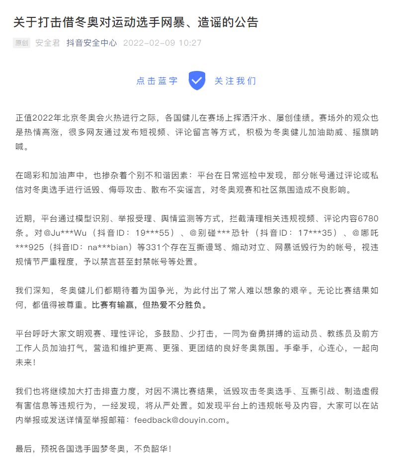 我们也将继续加大打击排查力度,对因不满比赛结果,诋毁攻击冬奥选手、互撕引战、制造虚假有害信息等违规行为,一经发现,将从严处置。如发现平台上的违规帐号及内容,大家可以在站内举报或发送详情至举报邮箱:feedback@douyin.com。