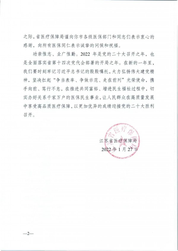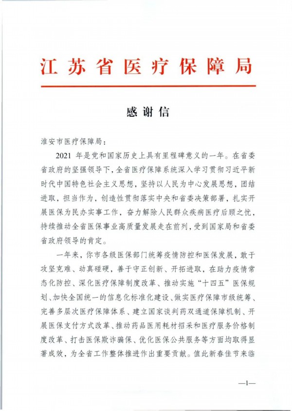 2022年1月27日,江苏省医疗保障局发来一封《感谢信》,对淮安市医疗保障工作为全省工作整体推进作出的重要贡献表示感谢。