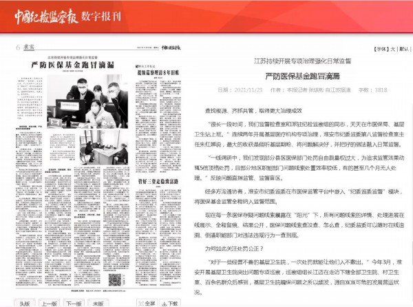 基金监管方式创新试点全面深化,创新试点顺利通过国家总结评估。2021年,处理违规医药机构1685例,追回、拒付、处罚9631.34万元;移交司法、纪检机关42例,媒体公开曝光典型案例427例;医药机构(参保人)严重失信4例、一般失信161例。互通基金监管情况及典型案例;连续两年被市委、市政府评为创新创优优秀项目,中国纪检监察报、中央纪委网站、新华日报、新华网等中央、省级主流媒体和国家《医保工作动态》刊登淮安医保基金监管经验。
