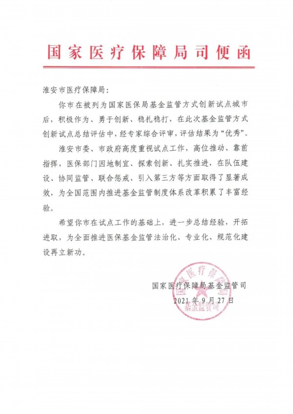 国家医保基金监管方式创新试点成效显著,总结评估全国前列、获评 “优秀”,代表全国26个试点市在全国医保基金监管工作会议作经验介绍,国家医保局胡静林局长、李滔副局长多次在会议上肯定淮安医保工作,基金监管多项指标居全省第一。