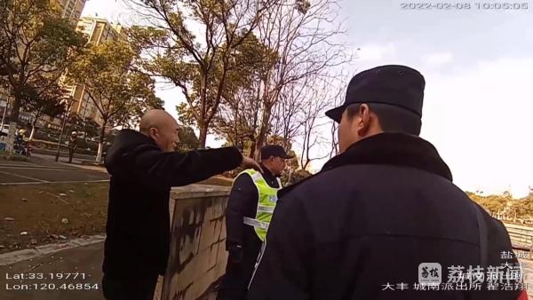 当天上午10点左右,有群众报警称在大丰区朝阳景都北门二卯酉河边有一名二十出头的男子情绪激动可能有跳河迹象,大丰区公安区城南派出所黄海路警务站站长单爱国接到警情后迅速出警。