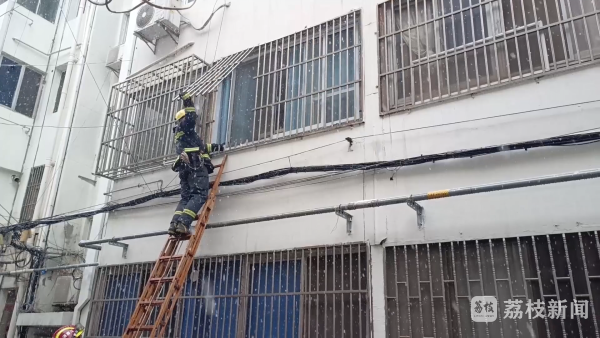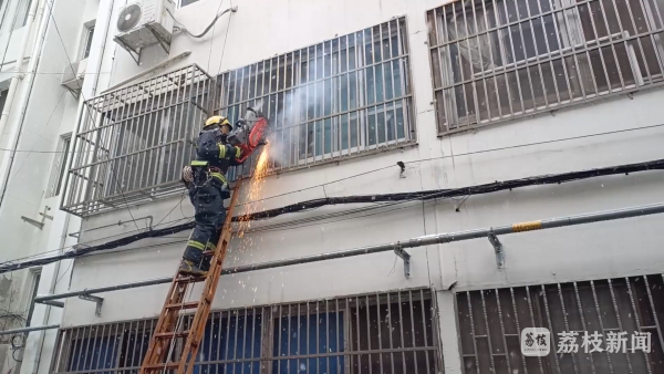 消防救援人员到达现场后,发现防盗门被反锁,无法通过钥匙从外部打开。老人的家属说,家中有两位老人,一位行动不便,躺在床上,另一位摔倒在卫生间。消防员随即使用六米拉梯攀爬至老人居所所在的二楼,用大力剪和无齿锯破拆防盗网,从窗户进入屋内,然后打开了门。