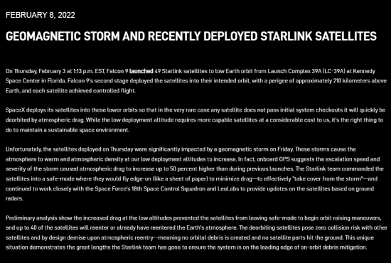 SpaceX公司2月8日发布的公告显示,该公司2月3日发射了49颗“星链(StarLink)”互联网卫星。不幸的是,在这些卫星被发射的第二天,有40颗卫星受到了地磁风暴的袭击。目前,已有多达 40 颗卫星将重新进入或已经重新进入地球大气层。