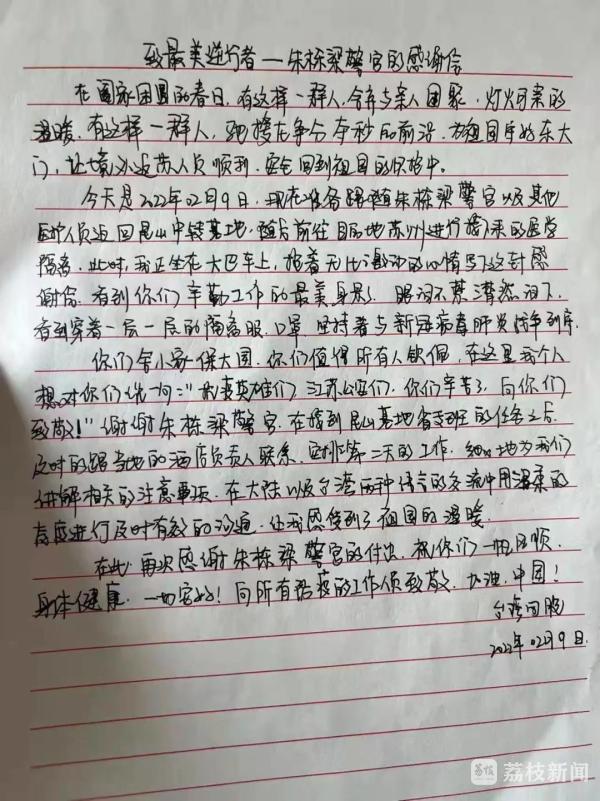 “致最美逆行者”“抗疫英雄们,江苏公安们,你们辛苦了!”……2月9日上午,从大年三十开始就在昆山执行入境来苏人员转运任务的连云港警队赴昆山转运专班队员朱栋梁,收到了一封台湾同胞手写的感谢信,打开一看字里行间满是对警察为民服务的赞许与感动。原来,就在前一天,朱栋梁照例电话与一名入境台湾同胞核对信息,详细告知对方入境后的注意事项,并耐心解答了对方的疑问。让他没想到的是,自己的行为令对方非常感动。