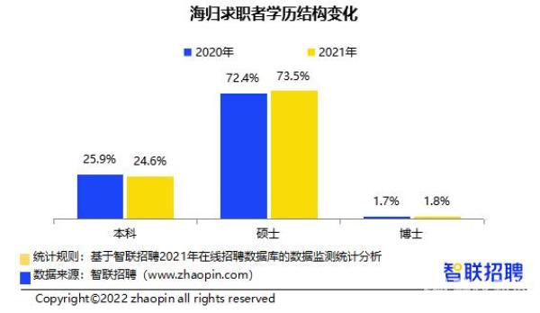 近年来,随着国内企业对海归人才偏好减弱,回国求职的海归群体增加,海归在国内的求职压力有上升趋势,2021年相对平稳。但面向海归的岗位结构有所优化,薪酬水平也大幅提高。从归国海归的求职情况看,高学历人才找到首份工作的用时缩短,低学历拉长,趋于分化。可见在整体就业压力加大的形势下,依然有更加优质的工作机会,对于海归人才来说,提升学历和技能,能够帮助自己找到更好的发展机会。