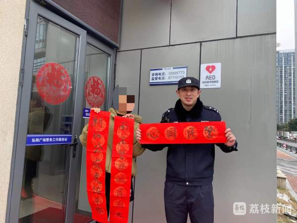 2月9日上午10点左右,南京市公安局江北新区分局特巡警支队弘阳广场警务站却收到辖区群众赠送的一副写着“南京警察以民为大,新区公安虎佑平安”的春联祝福,她说,这是自己手写的,一副迟到的春联谢民警帮助她找回丢失的电脑。