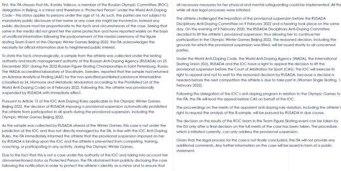 ITA还称,2022年2月9日,瓦利耶娃对临时禁赛提出质疑,并于当日举行听证会。RUSADA决定解除对其的临时禁赛令,允许她继续参加北京冬奥会。