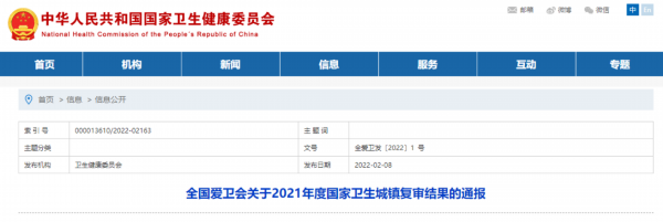 近日,国家卫健委网站发布《全国爱卫会关于2021年度国家卫生城镇复审结果的通报》。