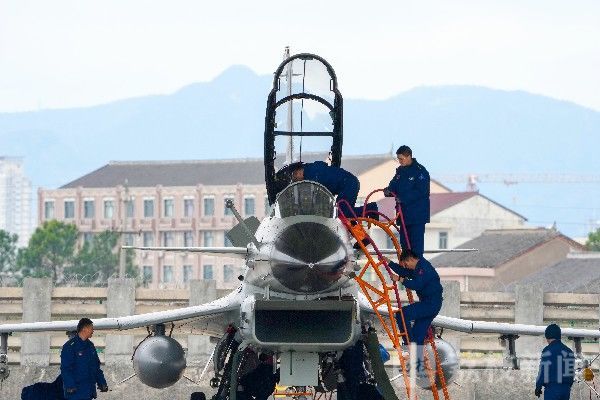 完成训练任务的战鹰顺利返航,机务官兵迅速展开地面保障,机体检查、油料补给、运弹挂弹,为战鹰再次升空做好准备。