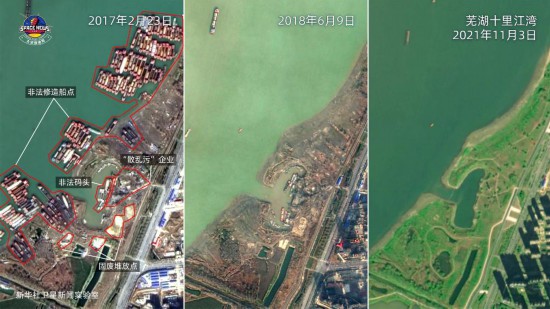 芜湖十里江湾便是其中之一。卫星“跨越时空”拍摄的图片显示,芜湖十里江湾船舶中介、运输繁荣一时,导致固废堆放、岸边毁绿种菜等乱象丛生。2021年11月3日的卫星图显示,这里拥挤杂乱的工厂、渔船和裸露的地块均已消失,宛如披上一层“绿衣”,郁郁葱葱的林木间,整洁的步道沿江蜿蜒。