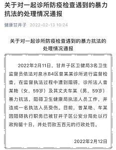 荔枝新闻讯 据微信公号“健康甘井子”消息,2022年2月11日,甘井子区卫健局3名卫生监督员依法对泉水B4区曾某某诊所进行监督检查,在监督执法过程中遭到阻碍,诊所法人曾某艳(女,59岁)及其丈夫车某(男,59岁)暴力抗法,阻碍卫生健康局执法人员工作,并造成一名执法人员受伤。 目前,曾某艳、车某因阻碍执行职务已被甘井子区公安分局处以行政拘留十日,并处罚款五百元的行政处罚。