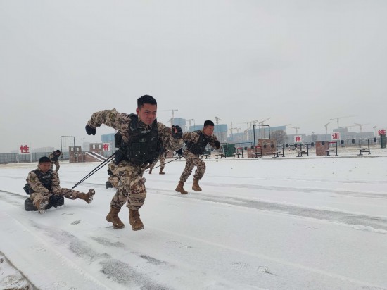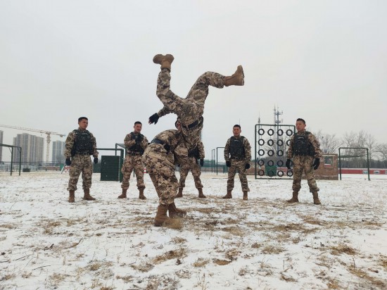 风雪寒冬季,练兵正当时。首都南郊满天飞雪,武警北京总队执勤第十支队的训练场却是热闹非凡,官兵们喊杀声震天,战斗热情高涨。据悉,该支队为磨砺恶劣天候下官兵意志品质和血性胆色,组织官兵冒着严寒在雪中开展搏击格斗、翻越障碍、极限体能等课目训练,旨在提高特战分队在各种急难险重环境中的综合作战能力,为遂行多样化反恐作战任务奠定基础。
