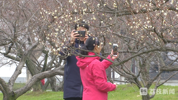 在扬州瘦西湖景区的湖上梅林,金黄油亮的腊梅花还未凋谢,粉红、雪白和淡黄的春梅已次第开放。在昆山亭林园,一株株梅花迎风绽放,俏立枝头。游客穿梭在花丛中,感受春意。
