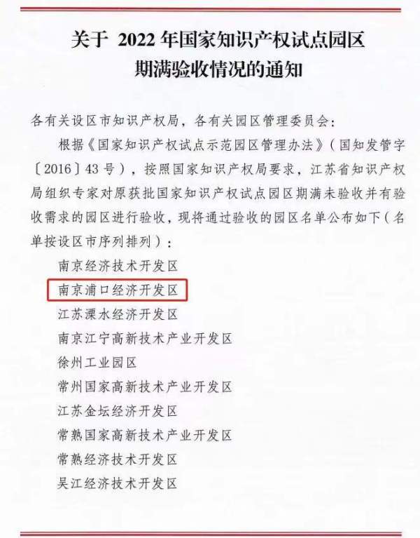 近日,江苏省知识产权局公布2022年国家知识产权试点园区期满验收结果,南京浦口经济开发区顺利通过验收,圆满完成国家知识产权试点园区建设目标。