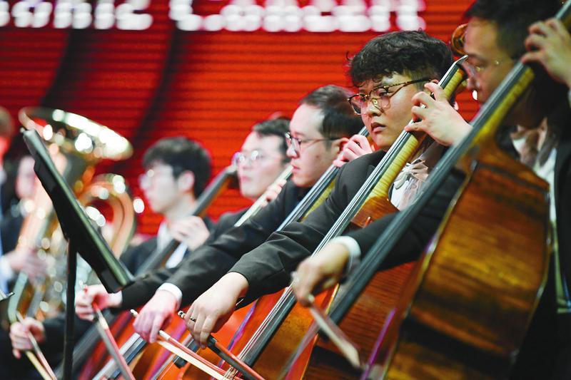 紧接着,一曲极具中国形象美的音乐代表作品《茉莉花》,使现场观众沉醉在音乐传递出的馨香中。《第一交响序曲》运用丰富的音乐表现手法,勾勒出一段“激情燃烧的岁月”。脍炙人口的舞剧《红色娘子军》选曲,让老一辈观众至今难忘,也让新一辈观众耳目一新。喜闻乐见的管弦乐作品《花好月圆》,在旋律优美的轻松节奏里,生动表现了人们在月下花丛尽情欢舞的场面。