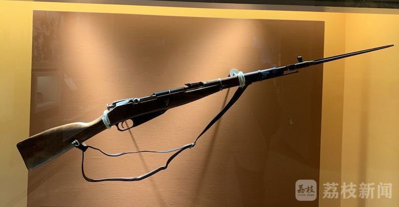 展览中,张桃芳的照片下方,陈列着他的武器——苏制“莫辛—纳甘”M1944式步枪。