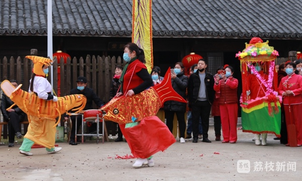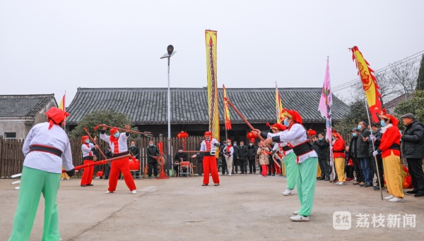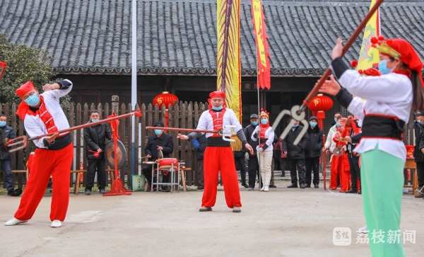 今天上午,在铿锵喜庆的锣鼓声中,一场精彩的民间绝技“张家镋舞”表演热闹上演,只见头戴红巾、身穿白衣、红裤的村民,将手中的五尺凤翅镋时而抛向高空,时而越过后背滑到掌心,不同的招式令人眼花缭乱,叹为观止。除了精彩的镋舞表演,还有舞狮、摇花船等民俗表演,这也让一旁的村民尝到了一道独特的“文化大餐”。村民张元国说:“我每年都会来看,看了十几年了,大家在一起聚聚也是把这个元宵佳节过的充实一点,快乐呀一点。”