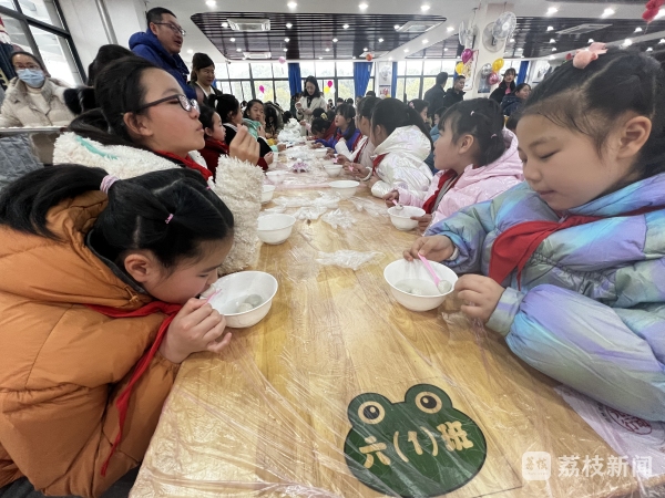 “做好的举起来给我看看,往前,往前伸...”在泗阳县第二实验小学,老师正在向孩子们介绍元宵节的传统习俗和汤圆的由来。在家长志愿者的指导下,大家从面团上拿下一小块面团,小手飞快地搓着,一会儿功夫,一个个雪白的汤圆在掌心逐渐成型。经过烹煮,热气腾腾的汤圆出锅,大家品尝着自己的劳动成果,每个人脸上都洋溢着幸福笑容。学生程阳说:“我不但学会了做汤圆,还尝到了自己做的汤圆,在这我祝大家像汤圆一样,团团圆圆,快快乐乐。”