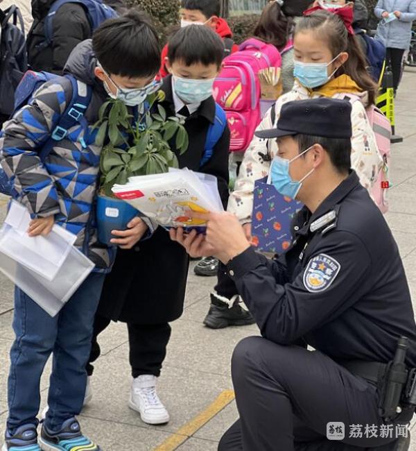 在校园“护学岗”上,民警杨懿行在执勤之余,将精心准备的“反诈书皮”送给刚刚领完新书的学生们,同时宣讲一些简单易懂的反诈知识。面对好奇心强的孩子,民警还会蹲下来和他们一起念一念书皮上的反诈内容,“陌生链接不点击”“陌生来电不轻信”等反诈标语。