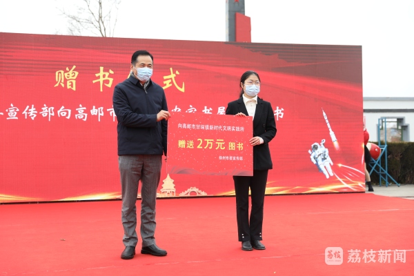 活动现场,扬州市委宣传部副部长、市文明办主任吴军为高邮市甘垛镇新时代文明实践所赠书。