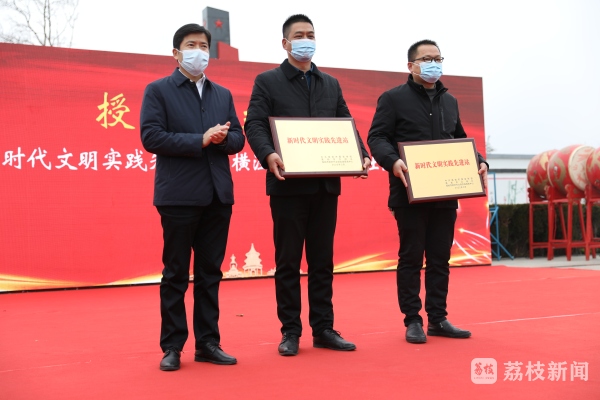 高邮市委常委、宣传部部长杨文喜为甘垛镇横泾社区、平胜社区两家新时代文明先进实践站授牌,并对10户文明新风户代表进行表彰。
