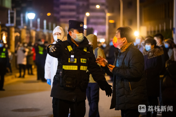 随着夜幕降临,梁溪公安分局崇安寺派出所副所长原森依然在锡师附小门口执勤,耐心解答一些学生家长的问询。“为了防止上厕所,我从早上开始就没有喝过一口水。”身穿防护服的他说。在他们执勤组里,还有一位59岁的老民警王德明,昨天刚值完班,今天早上就主动请缨参加防疫工作。