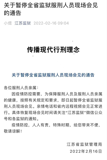因疫情防控需要,为保障服刑人员及服刑人员亲属的健康,按照有关规定和要求,即日起暂停全省监狱服刑人员现场会见。亲情电话和省内远程视频会见正常进行。具体恢复现场会见时间请关注“江苏监狱”微信公众号和各监狱的通知。
