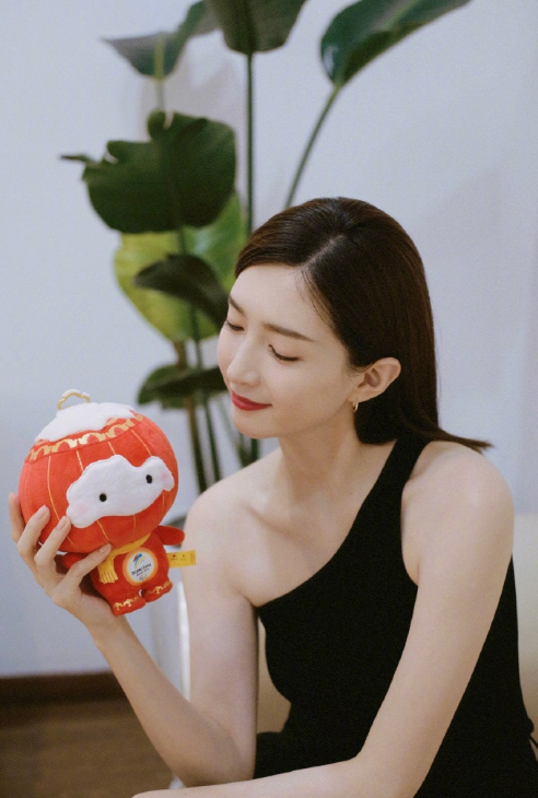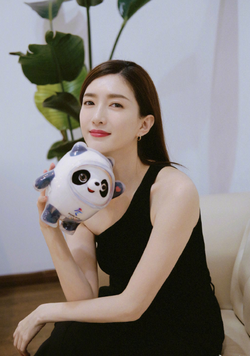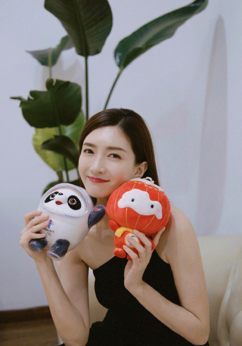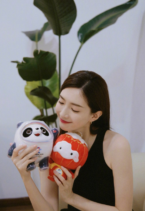 16日,江疏影晒出自己与冰墩墩雪容融的合影。