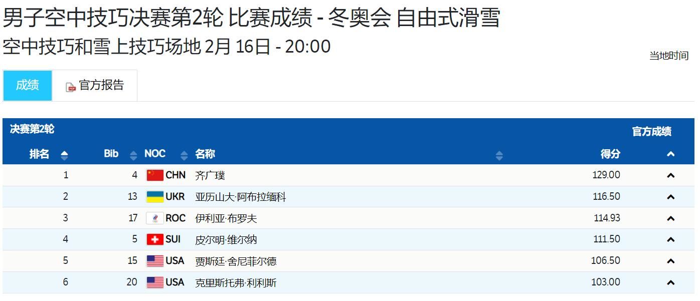 齐广璞以129的成绩夺冠,乌克兰选手获得亚军,俄罗斯奥委会队选手获得铜牌。