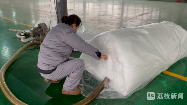 另一名车间工人王洪霞负责打包环节。她娴熟地将絮片卷入一根三四米长的铁棍中,絮片就像雪球一样,在设备匀速地旋转中越滚越大。最后将铁棍抽离出来,并装编织袋,打包后的絮片被送往服装生产企业进行加工。