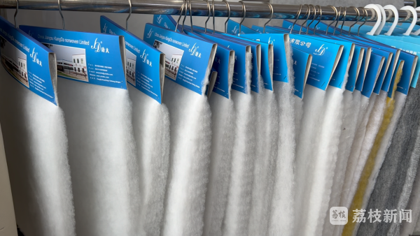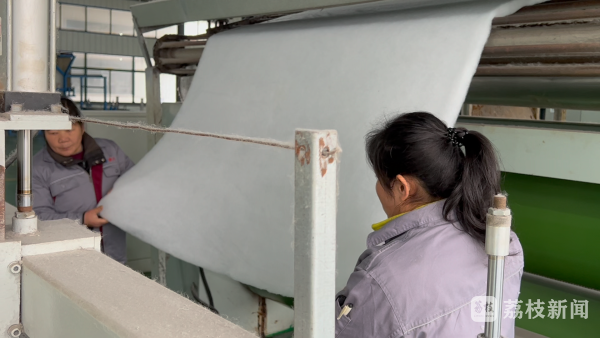 2月15日,在扬州仪征市的江苏康大无纺有限公司的工厂车间内,七八台设备正在匀速运转中,整个生产流水线,最少时,仅有4名工人。车间工人张影正等着生产出来的絮片运送到这里,再将絮片引入烘房内烘干。