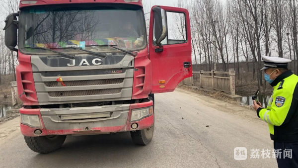 2月16日10时30分,徐州市交警支队贾汪大队五中队民警在辖区巡逻时,发现一辆装满货物的重型自卸货车号牌被翻下来了,执勤民警立即示意其靠边停车接受检查。