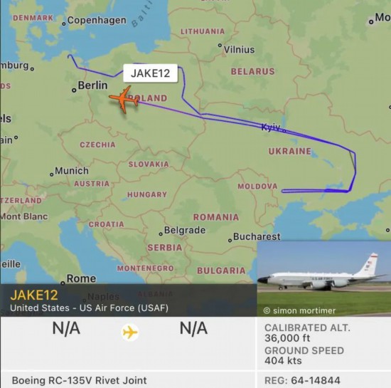 14日当天,美国空军一架RC-135V侦察机在乌克兰上空执行了一次短暂的侦察任务。