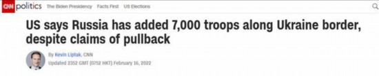 俄罗斯宣布部分俄军开始撤离俄乌边境地区之际,据美国有线电视新闻网(CNN)、美联社报道,一名美国政府高级官员当地时间周三(16日)晚声称,俄方有关撤军说法是“虚假的”,并且最近在靠近乌克兰边境的俄罗斯军队增加了7000人左右。
