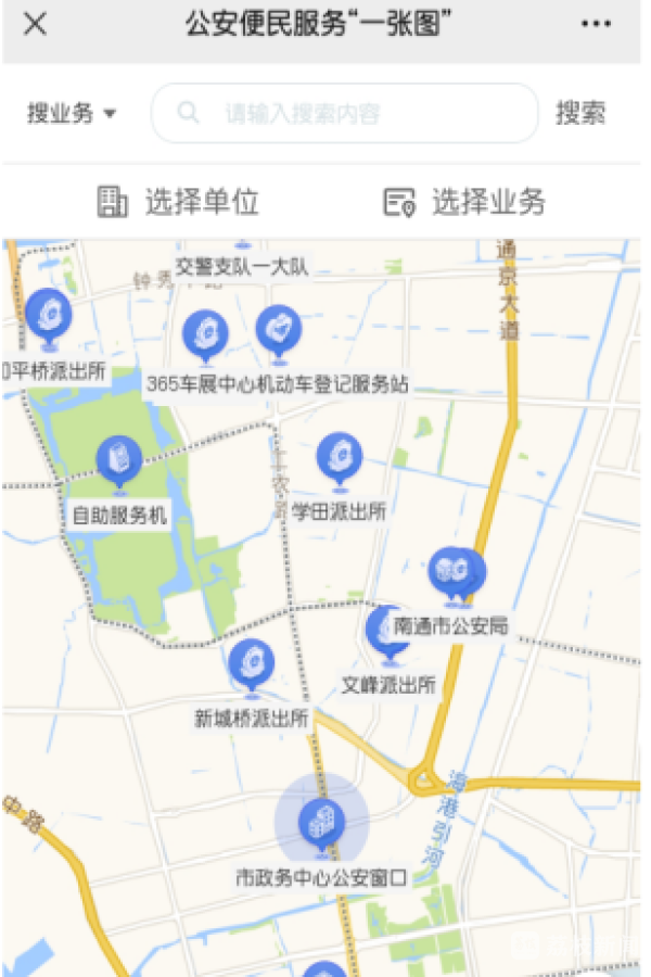 南通公安便民服务“一张图”使用起来也很便捷,办事群众可通过微信添加“南通公安微警务”服务号,点击底部菜菜单栏“微服务”进入“便民服务‘一张图’”。“一张图”功能应用简单“无门槛”,只需在搜索框中输入关键词,即可查询所在位置附近的政务服务中心、派出所、警务服务站等相关信息,享受“导航服务、办公时间、办理要求、所需材料、办理时限、查询点位、查询业务、参考样本、表格下载、点位照片”等10项服务事项。