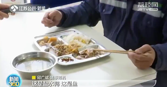 中午时分,很多过路司机都会到“司机之家”餐厅用餐。货车司机邱广斌说:“这是盐水鸭,这是鱼,这是粉丝,还有萝卜,还有汤,免费的。”