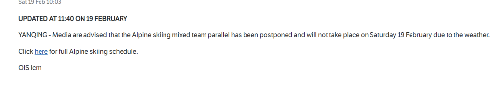 原定推迟至12时进行的北京冬奥会高山滑雪混合团体比赛因大风天气再次宣告延期,19日赛事取消,后续比赛计划待定。该项赛事原定于19日上午10时举行。