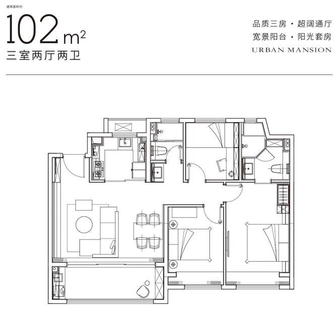 建面约102㎡【光幕】户型,南向三开间,宽幕视野,将自然引入室内;超大横厅与跑道式阳台相连,成为满溢阳光的“家庭聚场”,一家人有更多的时间欢聚于此。