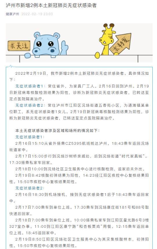 无症状感染者1:常住省外,为家具厂工人。2月16日回到泸州。2月19日新冠病毒核酸检测结果为阳性,诊断为新冠肺炎无症状感染者,已转送至定点医院隔离治疗。